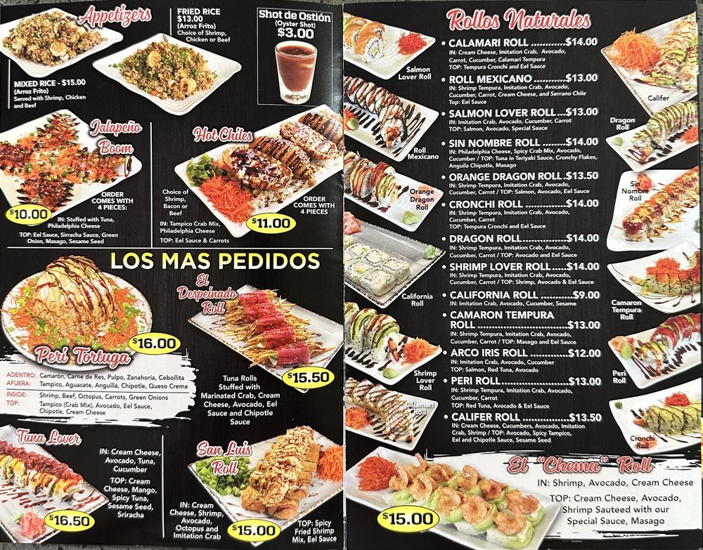 In: Philadelphia, avocado, camaron, pollo. Top: melted cheese, serrano peppers, chipotle, anguila.