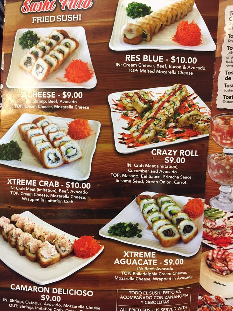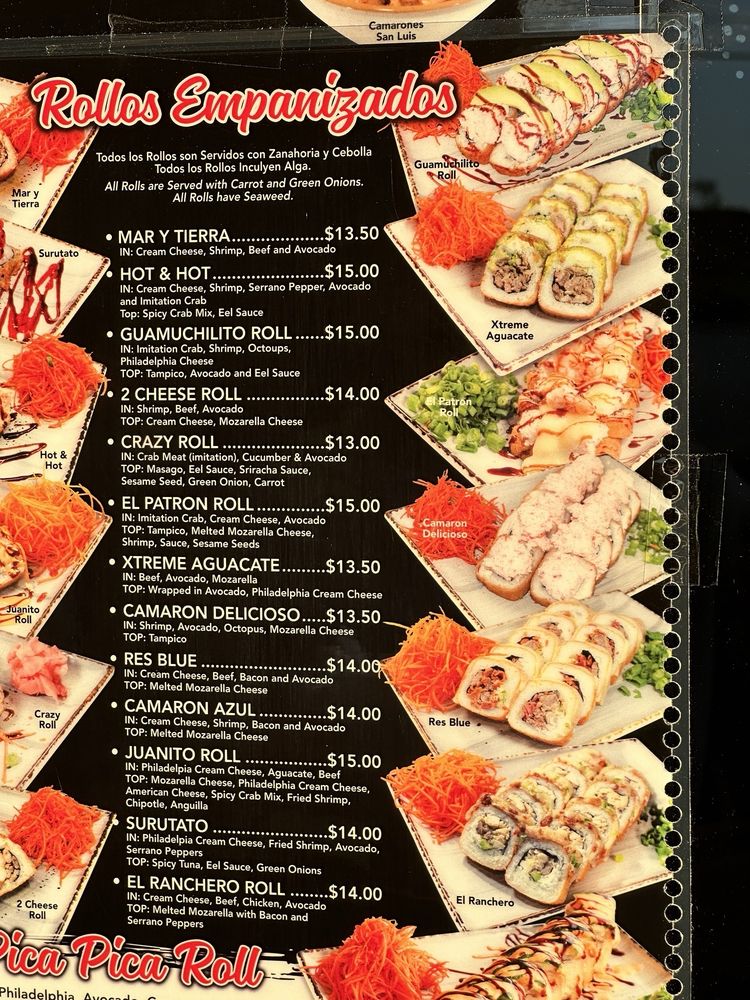 In: Philadelphia cream cheese, aguacate, beef. Top: mozzarella cheese, Philadelphia cream cheese, American cheese spicy crab mix, fried shrimp, chipotle, Anguilla.