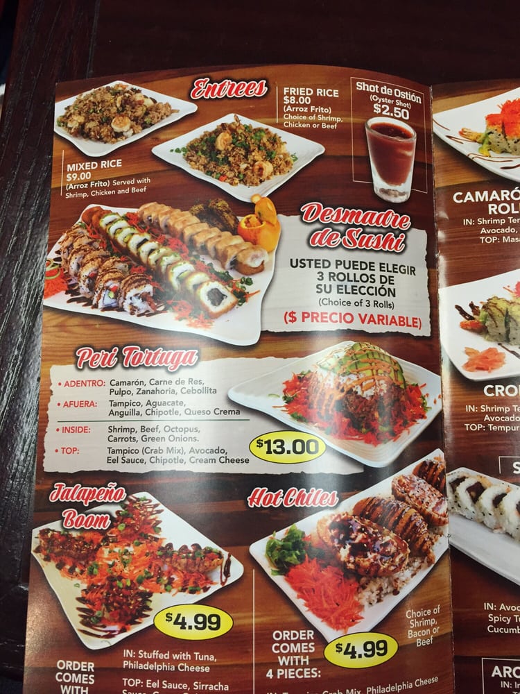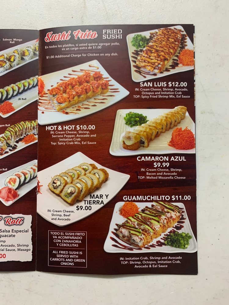 Adentro: camaron, carne de res, pulpo, zanahoria, cebollita. Afuera: tampico, aguacate, anguilla, chipotle, queso crema. Inside: shrimp, beef, octopus, carrots, green onions. Top: tampico (crab mix), avocado, eel sauce, chipotle, cream cheese.